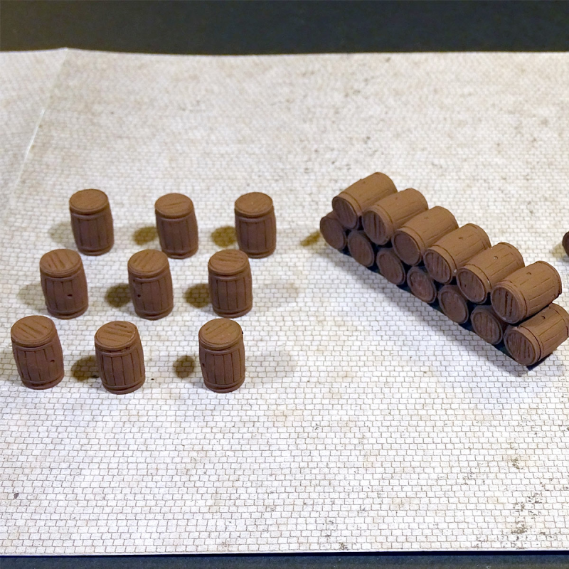 A l’intérieur des chais, on peut installer des barriques et aussi des foudres (lesquels ne sont jamais installés en extérieur), réalisés avec plusieurs couches de carton imprimé et découpé au laser (donc sans bombement), réunis dans la référence PRO 032 de Régions & Compagnies. Dans ce dernier cas, il va de soi que le chai ainsi équipé doit être doté d’un éclairage intérieur, pour créer l’ambiance si caractéristique des chais.