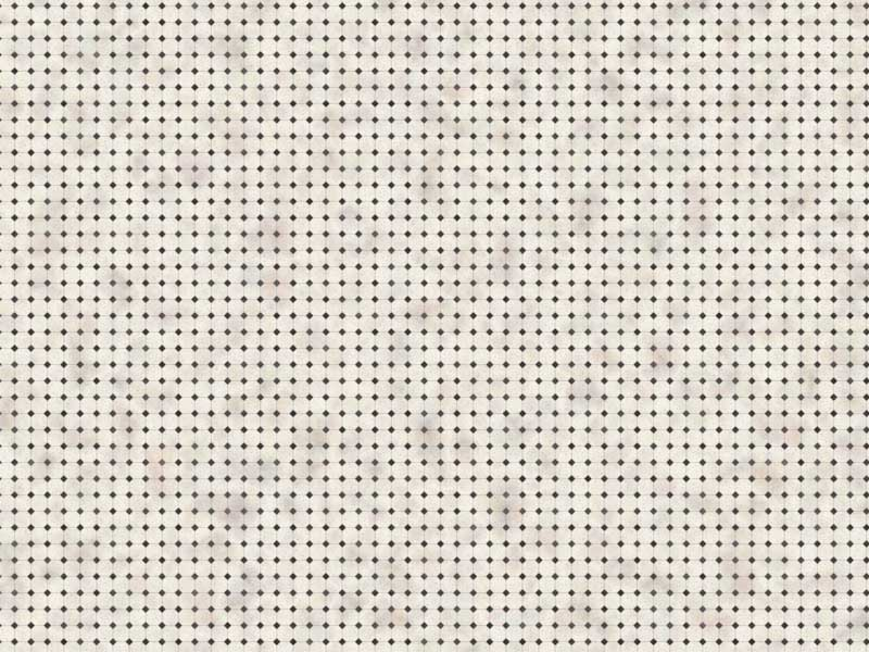 - Le carrelage « à bouchons » proposé est constitué de grands carreaux grèges et de petits carreaux noirs, posés à 45°.