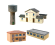Pour décorer votre réseau, LR Modélisme vous propose plusieurs ensembles de bâtiments ferroviaires ou civils, à découper dans de la carte cartonnée. Chaque ensemble contient 3 à 5 bâtiments, classés par thèmes. Ces bâtiments sont ceux qui sont proposés en supplément dans chaque magazine Clés pour le train miniature.