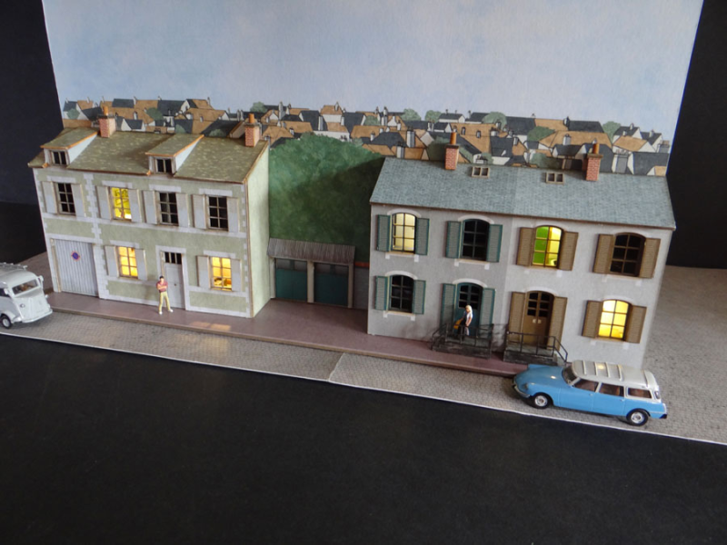 - Avec cette référence, on peut construire à l'échelle H0 une succession de trois maisons sur rue, de très faible profondeur, à savoir 30 mm seulement et de deux garages en retrait.